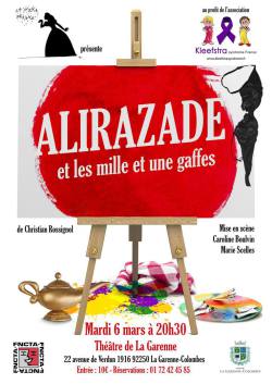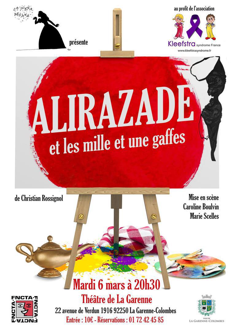 Quand un véritable génie, tout droit sorti d’une vieille lampe, débarque dans la vie de Valentin, peintre désargenté et sans talent, c’est tout son univers qui vacille. Entretenu par une tante psychorigide, secrètement amoureux de son modèle, Isabelle, et embarqué bien malgré lui dans le cambriolage de la bijouterie voisine, Valentin finit par accepter l’aide d’Alirazade. Mais est-ce vraiment une bonne idée ? Comédie contemporaine truffée de gags, coups de théâtre et rebondissements, Alirazade et les Mille et une gaffes entraîne le public dans une ambiance pleine de rires, sur un rythme effréné !